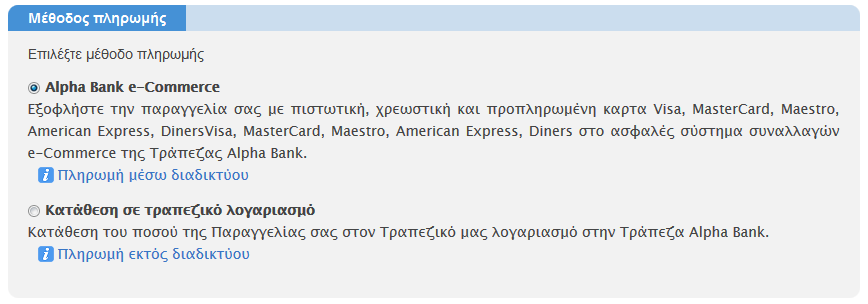 Αν επιλέξετε ως τρόπο πληρωμής το σύστημα συναλλαγών e-Commerce της Alpha Bank θα μεταβείτε στο ασφαλές περιβάλλον πληρωμών e-Commerce της Alpha Bank που εμφανίζεται στην παρακάτω εικόνα.