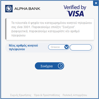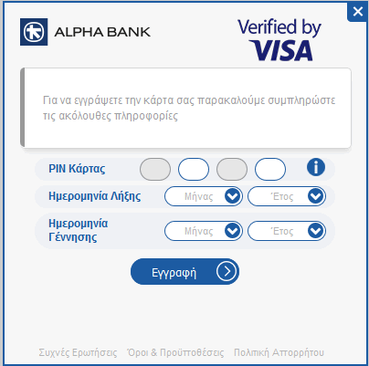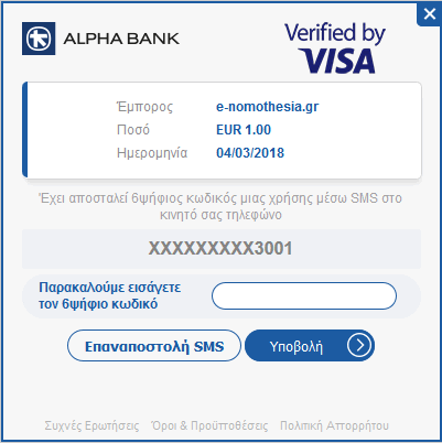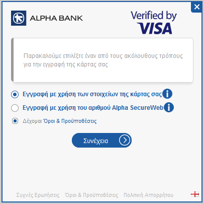 Κατά τη συνέχεια της διαδικασία θα σας ζητηθούν επιπλέον στοιχεία επικύρωσης για επιπρόσθετη ασφάλεια σύμφωνα με το πρόγραμμα πιστοποίησης συναλλαγών Verified by Visa και MasterCard Secure Code. Η υπηρεσία Alpha SecureWeb παρέχεται από την Alpha Bank σε συνεργασία με τη Visa, τη MasterCard™ και την American Express® κατόπιν εγγραφής, και σας προσφέρει ασφάλεια στις αγορές σας στο διαδίκτυο με όλες τις κάρτες Visa, MasterCard™ και American Express, προστατεύοντάς σας από μη εξουσιοδοτημένη χρήση των στοιχείων της κάρτας σας.