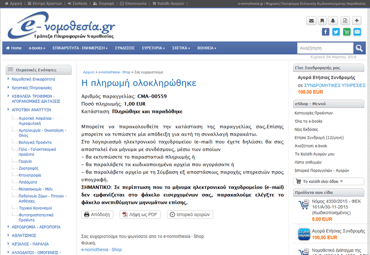 Όταν η πληρωμή ολοκληρωθεί με επιτυχία τότε η οθόνη του υπολογιστή σας θα επιστρέψει στον ιστοχώρο του e-nomothesia.gr και θα σας εμφανίσει μήνυμα για την ολοκλήρωση της παραγγελίας.